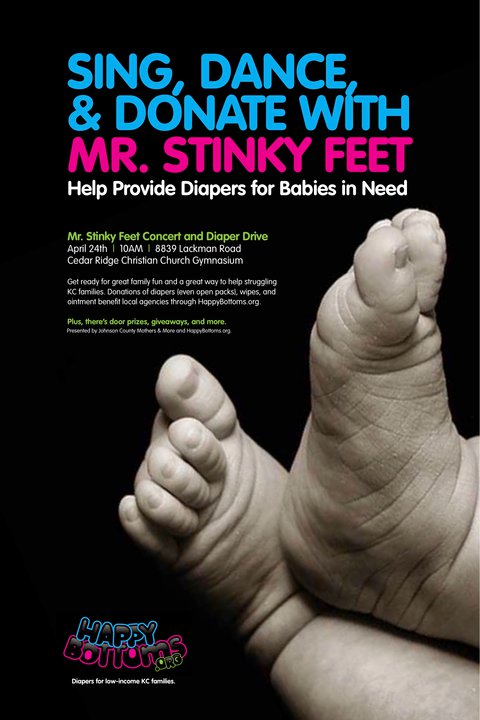 Join our friend Mr. Stinky Feet as he hosts a fabulous FREE concert this Saturday, April 24th. You're invited to bring diapers to donate to HappyBottoms.org while dancing and singing for a great cause!
