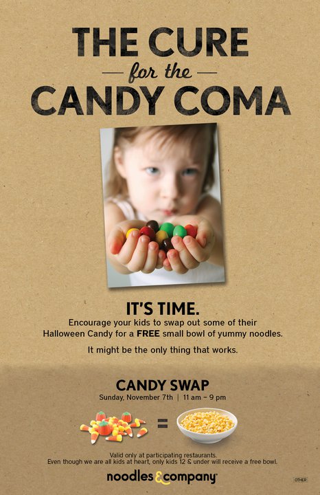 Our friends at Noodles & Company are hosting a candy swap tomorrow, Sunday November 7th at all area metro locations.  How does it work?